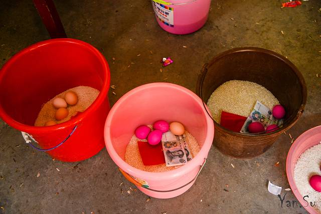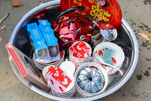 在婚礼的头一天就开始准备了宴席了,宴席的地点在祠堂等一些大的场所,做饭的人可以是新人的亲属,也可是村里帮忙的人,安排好后写在红纸上,贴在厨房门口,这样谁负责什么就可以一目了然了,当地的风俗,凡事给过红包的,可以一天吃三顿,我递了一个小红包,吃了中午和晚上两餐。图上是村民送的红包,包括钱、红鸡蛋(染红的鸡蛋)和大米,寓意好像是发财、吉利、甜蜜。