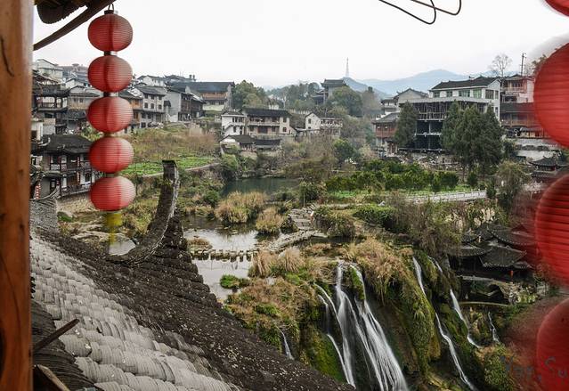 吊脚楼大哥家的红灯笼,瀑布两遍由跳岩连接,枯水期水很小