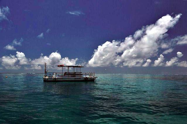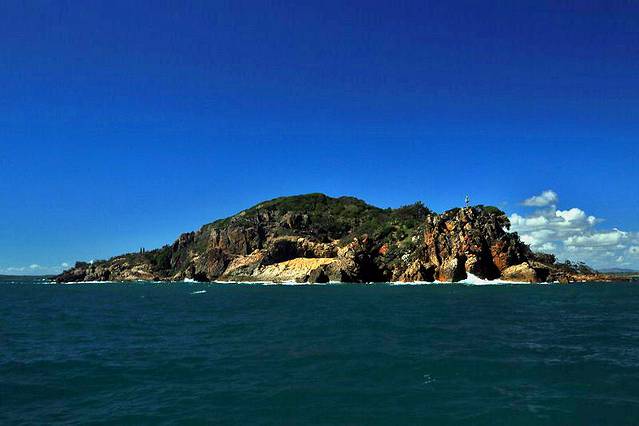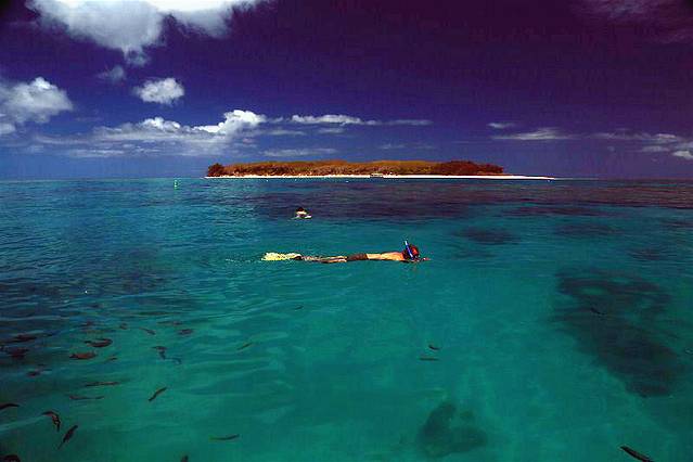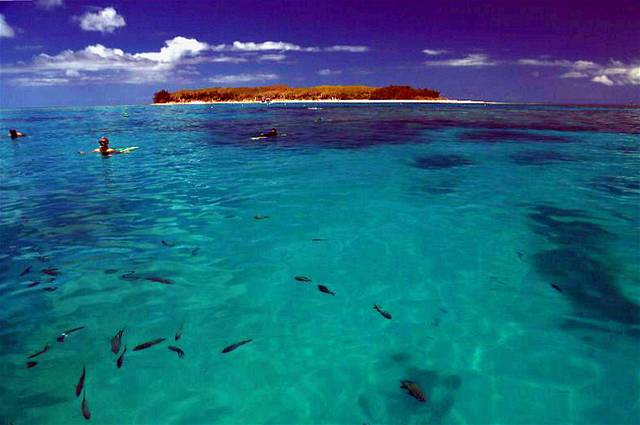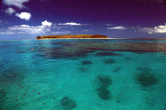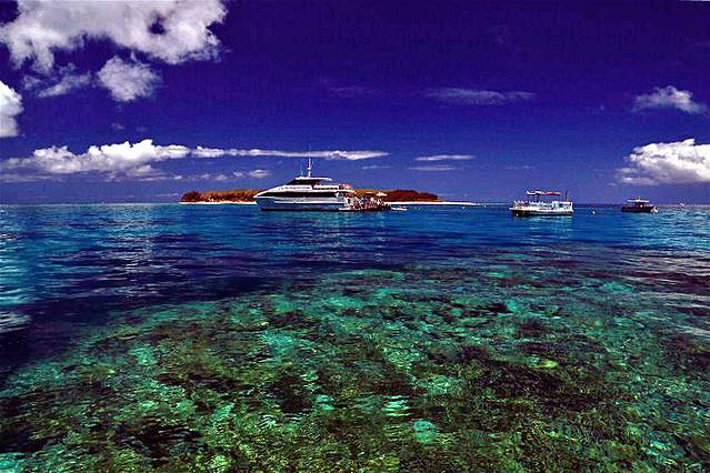 再看大堡礁。如果说黄金海岸给了我们充分享受,那大堡礁则是让我们得到最大的惊喜。有人说它是世界七大自然景观之一,也有人称之为世界第七奇迹,毫无疑问它是世界上最大、最长的珊瑚礁区,是澳洲人最引以自豪的自然景区。大堡礁实在太大,沿着东海岸延绵达两千多公里,有2900个独立礁石和900个大小岛屿,有名的景点都有几十个。这么大的景区是无法游完的,我们也懊悔没有多作功课多安排时间,所以只能选择就近的看看。当我们乘坐游览船进入到B景区的一个环形礁时,这里的海域顿时风平浪静,灿烂的阳光照射着海面,船下的景色清晰地展现在我们面前,这完全是一个五彩斑斓的彩色世界,五光十色的热带鱼在多姿多彩的珊瑚中自由的穿行,色彩缤纷的珊瑚树和奇形怪状的礁石群给我们呈现出一个完全不同的海底奇观。我们随着浮潜的人群进入到这个海中生物王国,与热带鱼群来了个亲密接触,尽情享受着这个奇妙世界带给我们的欢乐。尔后我们乘坐小舢板登上了其中一个圆形的由细沙环绕的原始小岛,小岛上的原始雨林是东南亚水椎鸟的繁殖地,成群栖息在此的海鸟翩翩起舞,顿时,一个生机勃勃的大堡礁呈现在我们眼前:飞翔的海鸟,游弋的鱼群,鲜艳的珊瑚,迷人的岛礁,加上浪花点点的碧海和白云朵朵的蓝天,真是气象万千。遗憾的是,这么好的地方目前正在受到温室效应气候变化的影响,大量珊瑚白化,据说已有700座礁石成危险区了。这应该算我们大堡礁惊喜旅程中看到的惊心一幕吧。