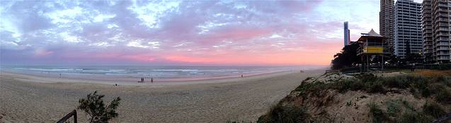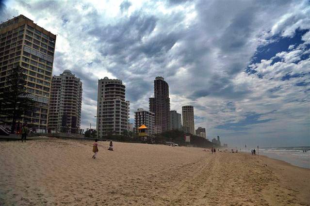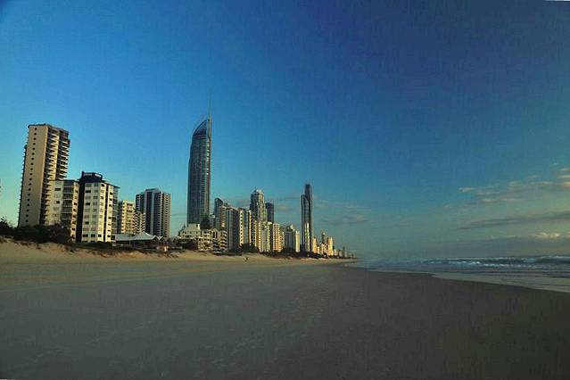 先说黄金海岸。世界上叫黄金海岸的很多,国内都有好多个。但我觉得这里才是真正当得起这个名字的地方,那沿着海岸线绵延42公里长的金色沙滩每天都吸引着无数游人前来度假旅游休闲。我们住的酒店就在冲浪者天堂海边,这个现在的市中心就是是黄金海岸的起源。以前这里只是荒芜的海滩,直到有人在这里开了个“冲浪者天堂”的小旅馆才吸引人们前来,随着人来得越来越多,沿着海边陆陆续续盖起了不少宾馆、酒楼、商场和旅游服务设施,到后来又有了什么电影世界、梦幻世界、海洋世界等主题公园,并逐渐发展成为举世闻名的旅游胜地。站在海边,一面是摩天大楼林立的现代化都市,一面则是宽阔漫长的诱人沙滩,让人感觉到城市与自然在这里的那种巧妙结合。走到沙滩,遍布海滩的太阳伞下躺满悠闲的游人,白浪翻滚的海中闪现着冲浪者的身影,使人迫不及待的换上泳装加入到弄潮儿的潮流中去。一连几天我们都迷恋在这金色海滩,这里的日出别样辉煌,这里的晚霞格外灿烂,就连夜色的和风细浪都是那样诱人,吸引着对对情侣来这里浪漫。黄金海岸给我们留下了难忘的印象。