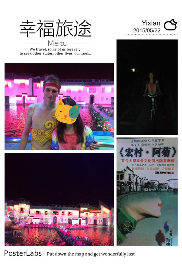 晚上7点半到8点半看了阿菊的表演,总体来说比起张艺谋的印象系列还是差一点,不过灯光舞台效果还是达到一流水平,外国的特技小哥真的好帅!有没有!!依然是去哪儿网上订票100一张17块返现还是比较划算的。其次就是交通问题,由于没有大巴车,我们选择骑自行车去观看的表演,山路上坡下坡比较累,主要还没有路灯,回来的时候还是有点怕怕的,租车费10块一个人,还是比较划算的~强烈建议大家租电频车去观看表演!