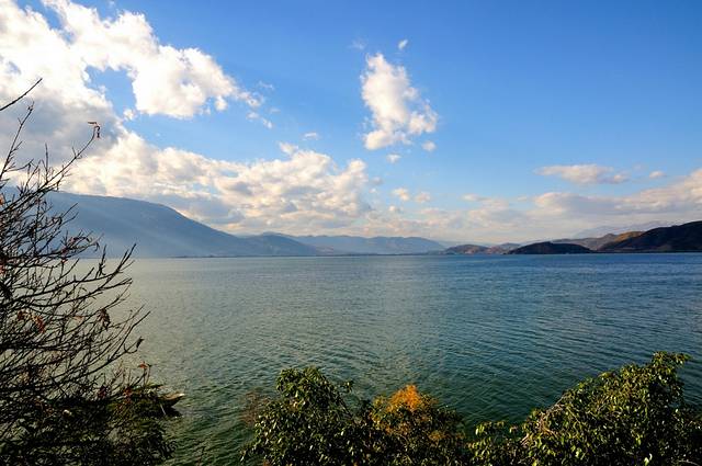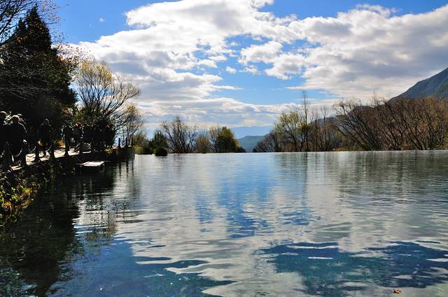 湖岸四周植被繁茂,远处雪峰背衬。湖水是透明的蓝,近乎凝固的湛蓝中,些许的绿意点缀其间。于湖心四顾,白云连横,浮于山际,倒影在湖面,如梦幻影,疑是仙境。