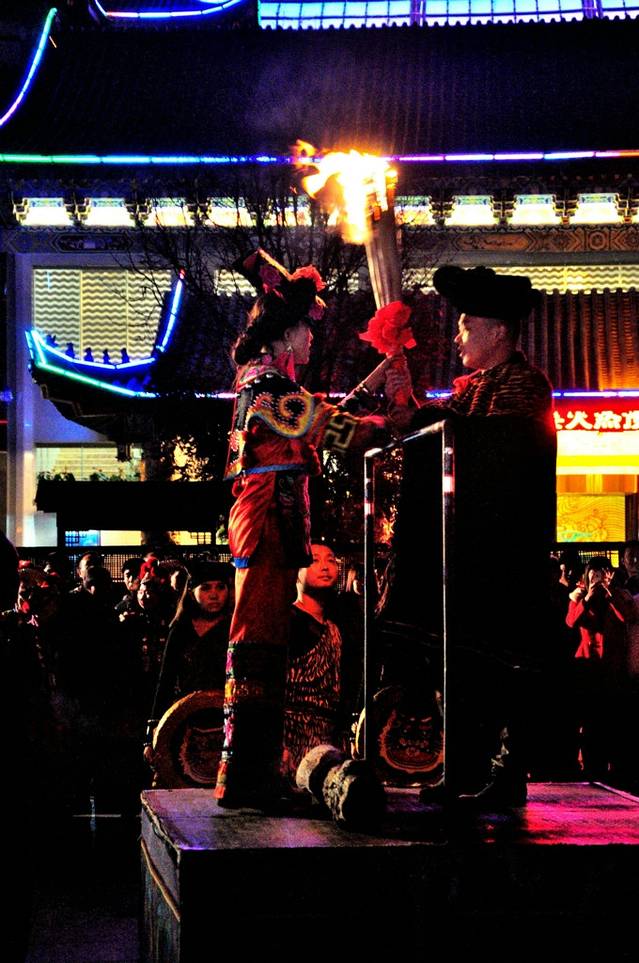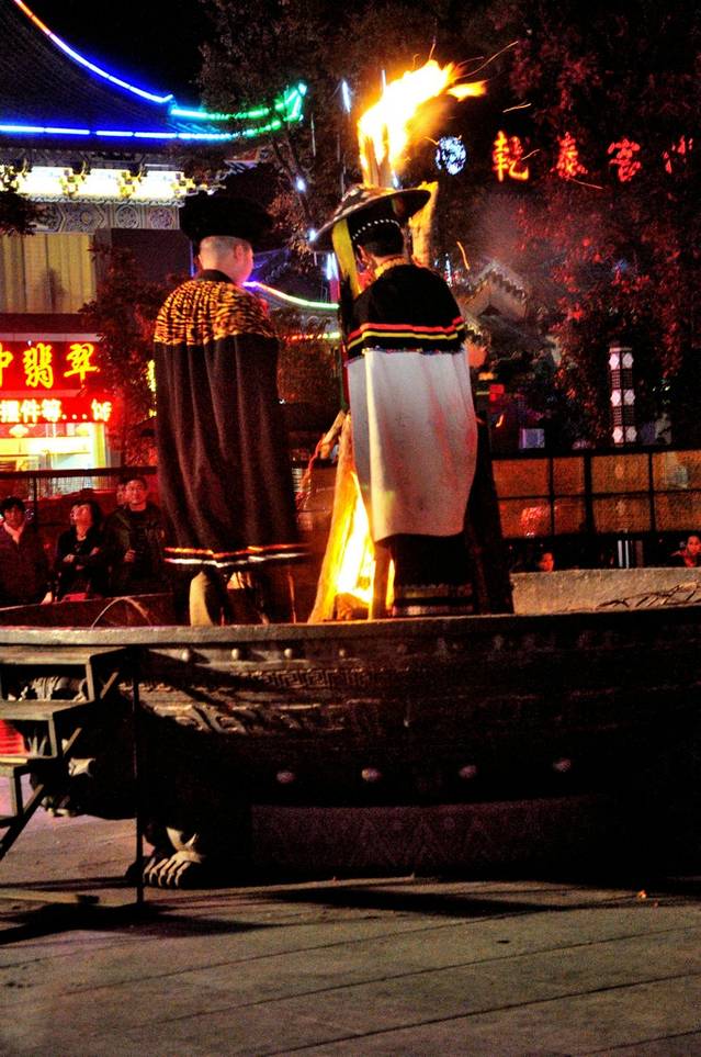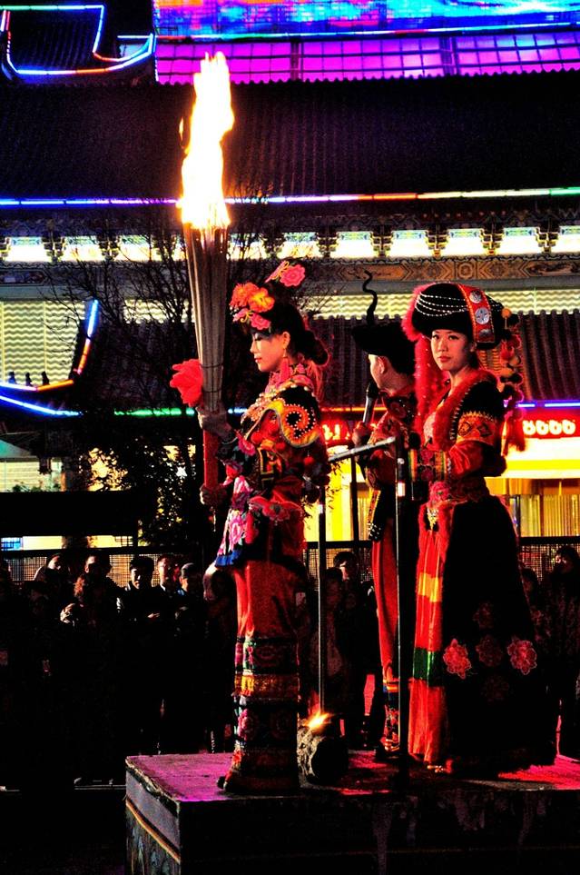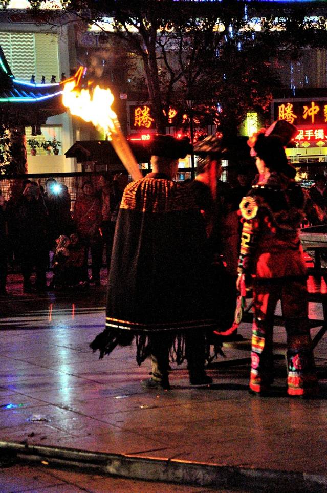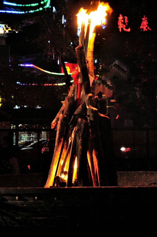 晚上用过了长街宴后,我们参加了彝族的祭火大典.(火把节是8月14日,而今天是8月11日,临近这次盛典了,彝人古镇里也都装扮好了)。