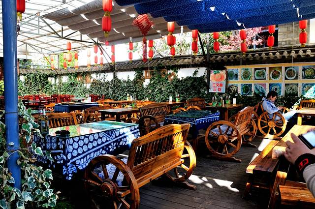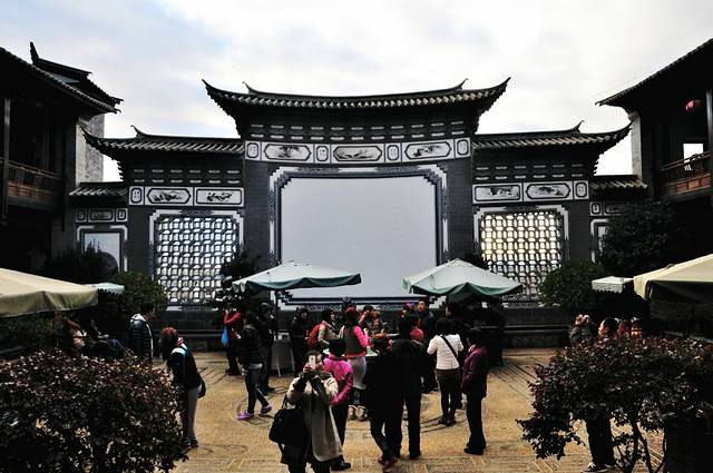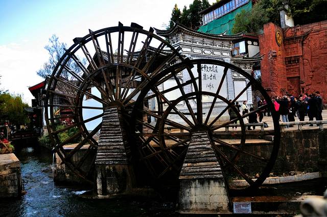 位于古城与新城交界处的大水车是丽江古城的标志,古城里有三房一照壁的民居,那照壁就象各位嘉宾看到得着一块。