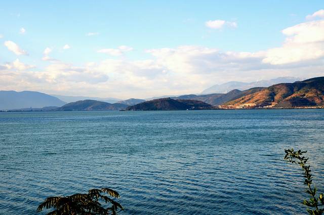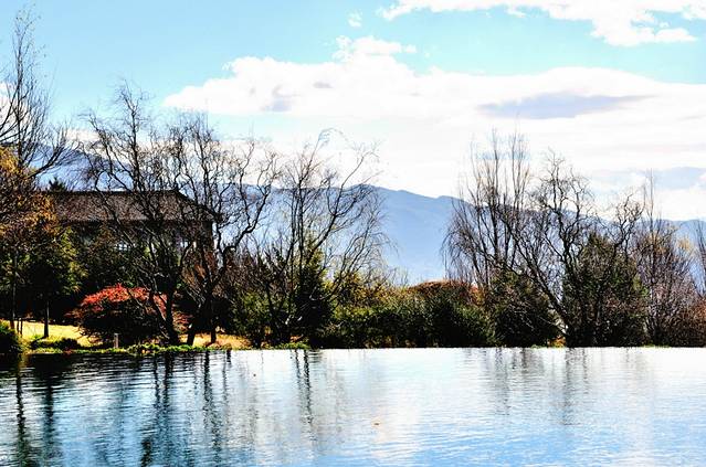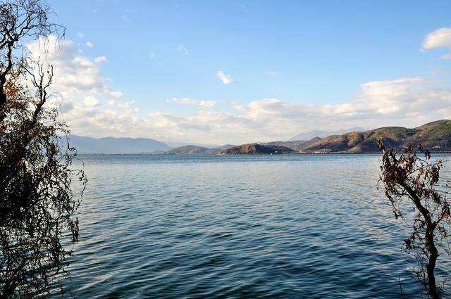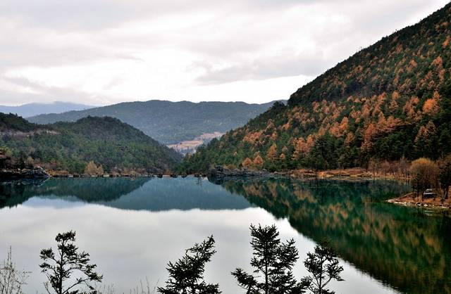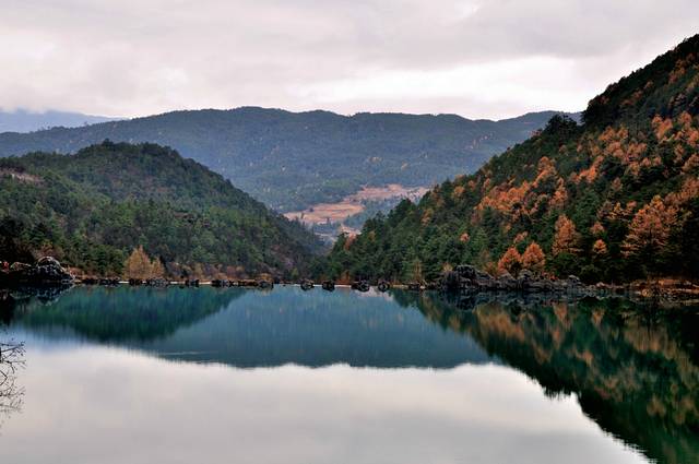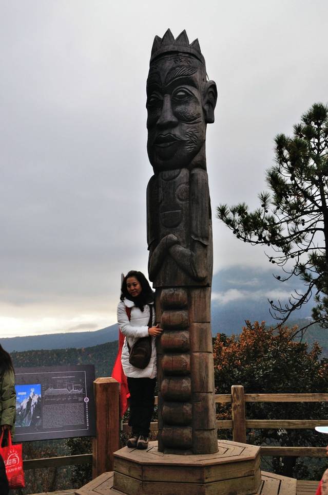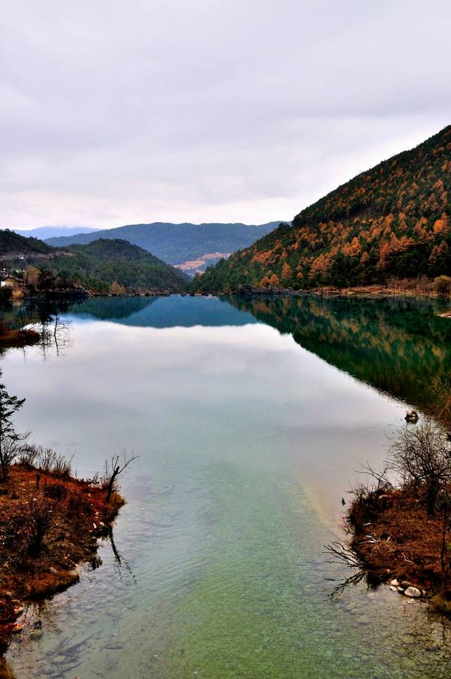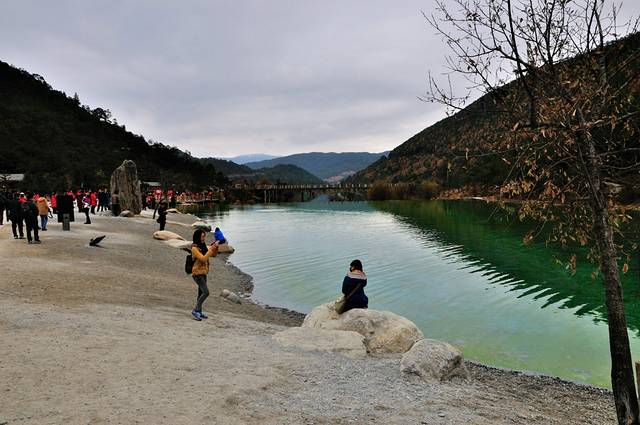 北眺是高耸云天的玉龙雪山,景致雄奇变幻。民谣说它“一山有四季,十里不同天”。这里素有“动植物宝库”的美誉,又是巨大的天然水库,今日雪山雪不多。