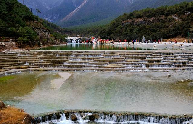 蓝月谷中的河水在流淌过程中因受山体阻挡,形成了四个较大的水面,人称“玉液”湖、“镜潭”湖、“蓝月”湖和“听涛”湖。