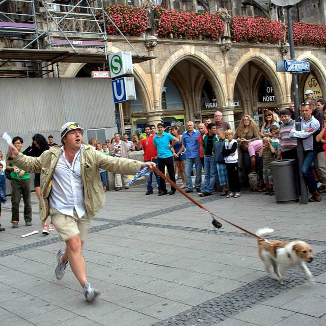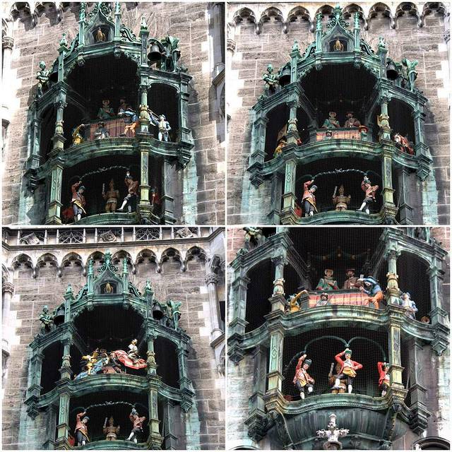 满广场挤满了围观的人群,大家都在昂头凝视着市政厅塔楼中间的三层窗口,焦急地等待十二点整点的到来。不一会,空中回荡着钟声、音乐声,塔楼里的机械人偶都活动起来,转着圈地演译着巴伐利亚民族古老的故事,人们都紧张的举起相机、手机按动快门......