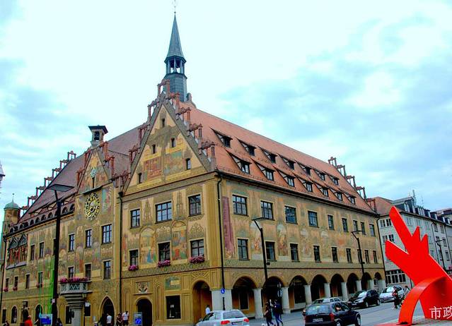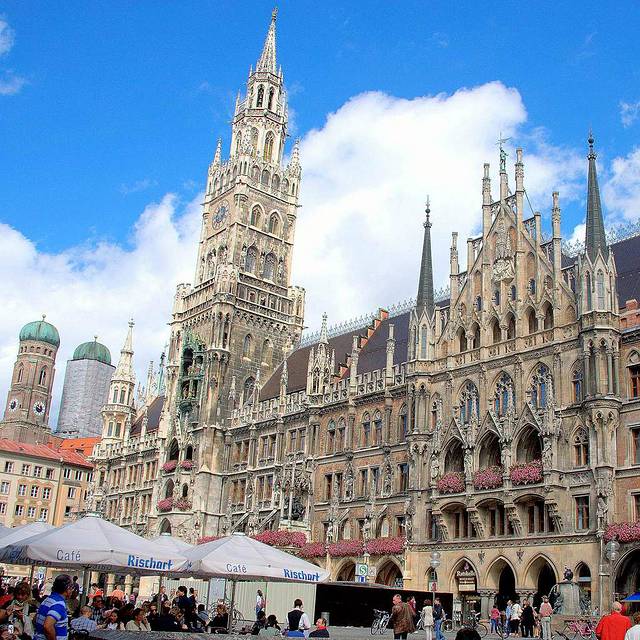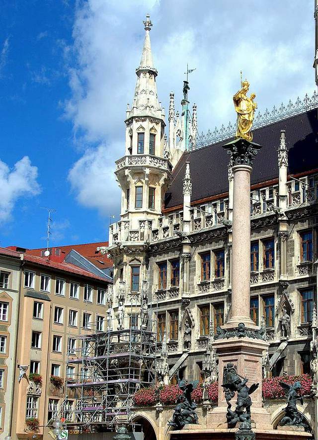 中央火车站紧邻市中心,坐上两站地铁就到达玛利亚广场。玛丽亚广场是慕尼黑 老城的中心,从地铁站出来,抬头就可以看到雄伟壮丽的新市政厅。 新市政厅是一座以黑色为外墙主色调的新哥特式建筑,古朴的门面因为有了高处一丛丛鲜花的点缀而充满了生气。登上85米高的塔楼,可以俯瞰城市风格。新市政厅门口那条路是熙熙攘攘的步行街,有几间作坊式小店,售卖巴伐利亚风情的精美手工制品。