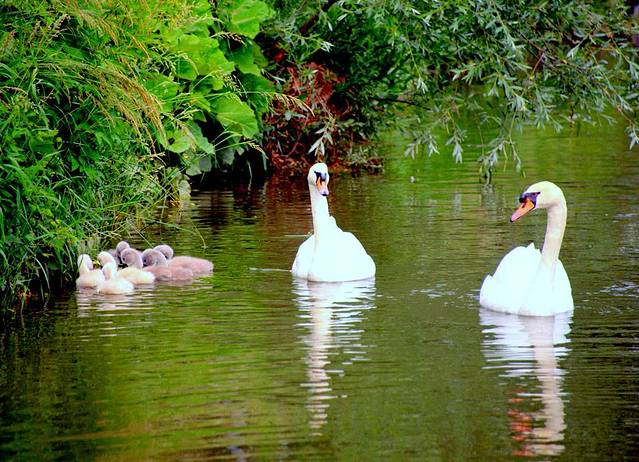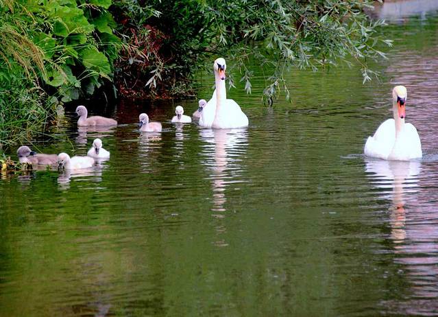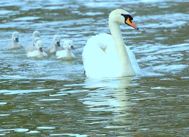 突然,在一段有点隐蔽的河湾处,出乎意料地被我发现了两只白天鹅和七只丑小鸭,真是喜出望外。