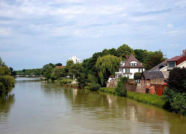 两岸的景色很美,河堤斜坡上常有游人在晒日光浴,河面上有海鸥在游弋飞翔。