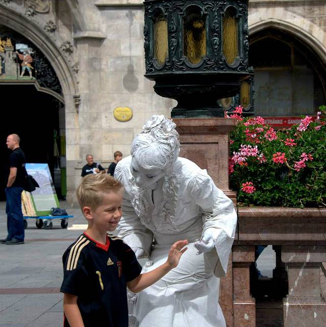 表演结束了,人群又簇涌到各街头艺人的秀场,津津有味地欣赏和配合着与艺人互动。妈妈则带着孩子和天使对话。