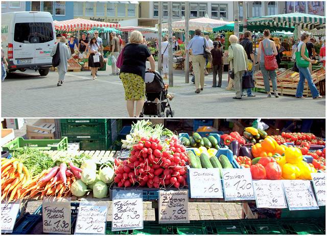 另一侧卖农副食品 ,蔬菜、水果都是明码标价,按1:8算算可能认为1磅的人民币价钱不算太贵,可有些是以个为单位计价,就不好说了。我们花6欧元买了1磅大樱桃,还可以接受吧。