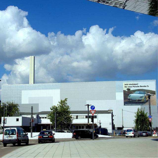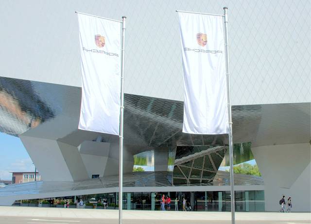 走出地铁车站,就能看见保时捷汽车工厂,厂房高墙上保时捷大牌很招人眼球,对面就是博物馆很特殊的造型。