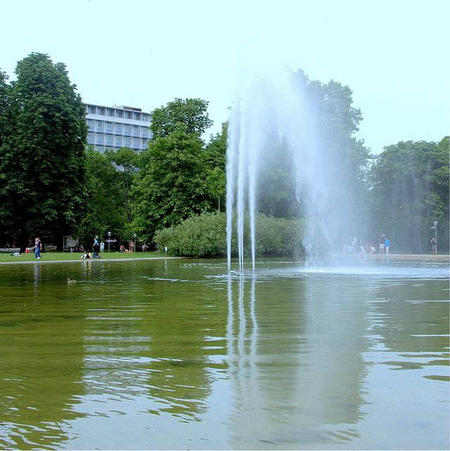 下园中央是个湖。 湖边有草坪,有很大的石凳,是休闲和孩子们嬉戏的绝好场所。四周围除了有饮食店和几座雕塑、小水池外、都是些标志性建筑,最著名的要数州立剧院