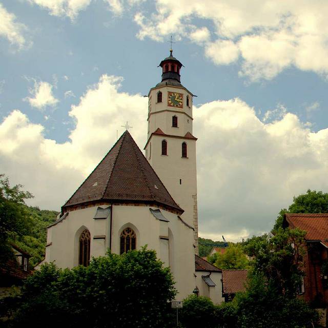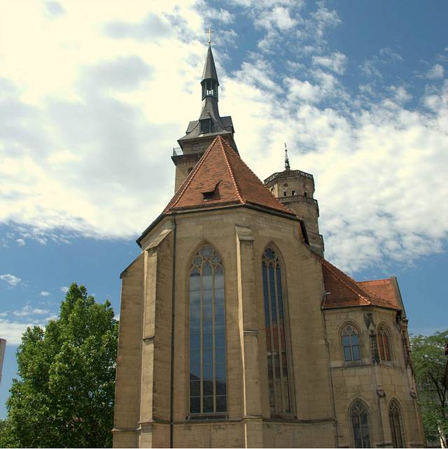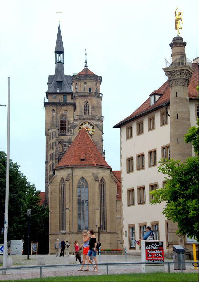 修道院教堂(Stiftskirche)是斯图加特最老的建筑,它的两座式样不一的尖塔是斯图加特城市的标志。南塔的底层是1175年罗马时代建筑的残存部份,一百年之后UlichI伯爵下令在当年罗马建筑上建造了一座教堂,教堂内目前还有伯爵的墓碑和浮雕。15世纪初,教堂改建成后哥特式风格,1534年第一次在这里举行祈祷仪式。