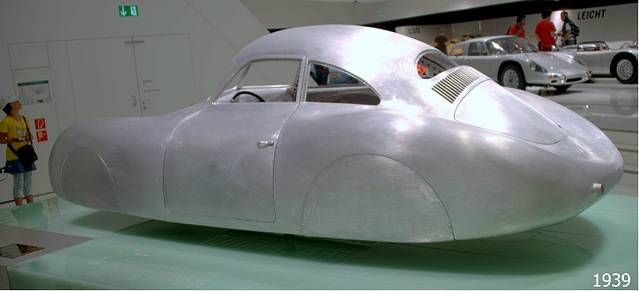 上到展厅,首先看到的是一台银白色车壳。这是1939年保时捷公司首款以保时捷命名的产品:TYP 64车型,采用改进后的33马力水平对置发动机,最高时速达140km/h。该车身是铝合金手工打造。