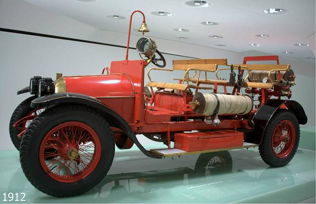 1912年生产的一台老式救火车,备有各种工具、消防器材以及警铃。这台车配备的是4缸发动机,最大功率20马力,最大时速50Km/h.