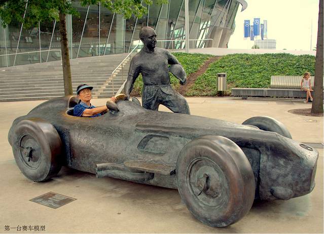 展馆前有一座世界第一台赛车的模型雕塑。进展馆参观前,人们常首先坐进模型车座留个影。