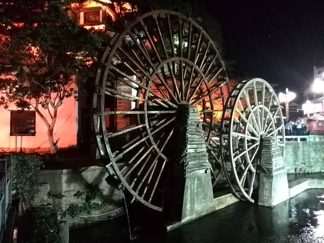 一路随着人流,路过丽江的酒吧,酒吧是依小溪而建,唱着吵杂的歌声,再往前走就到了大水车了,丽江的标志物,之后就返回客栈了。因为丽江有很多小街小巷,很容易迷路,所以推荐大家还是原路回去,但迷路了也没有问题,百度地图是很给力的。