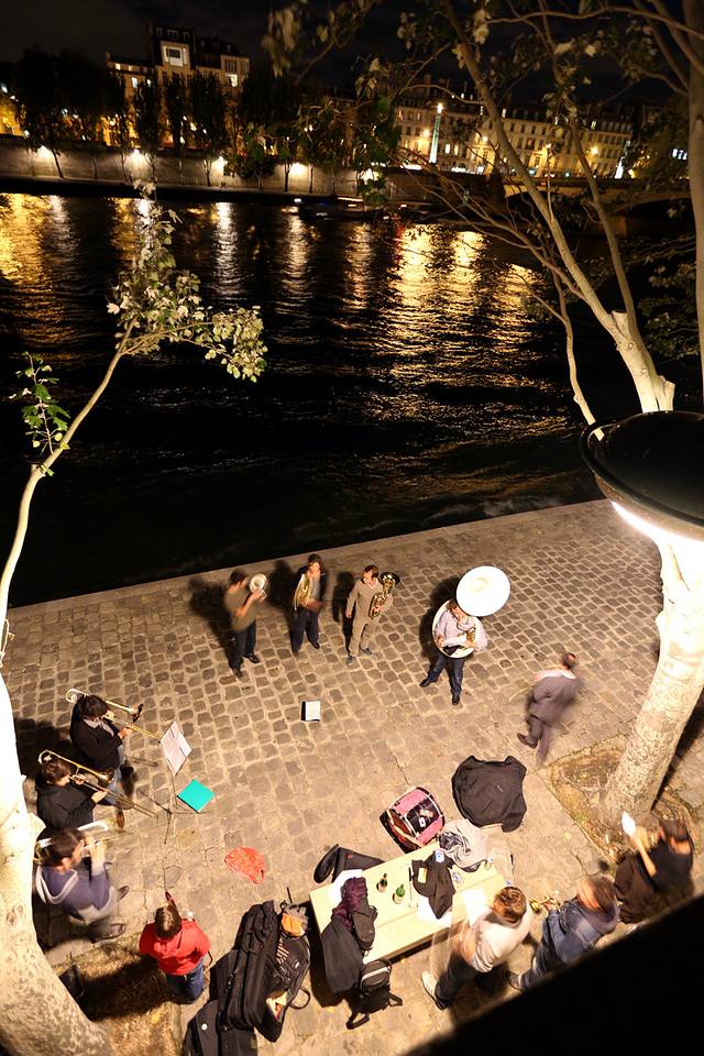 在塞纳河边,有个乐队在练习弹奏,古典乐器搭配着时尚的劲爆舞曲,混搭的相当和谐