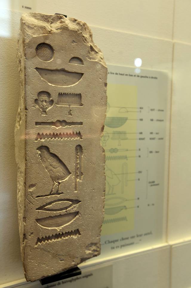 在展厅的一个拐角处,看到许多这样的象形文字的注解,大概是在告诉大家什么样的图案代表了什么意思,也就是在解释象形文字破译的过程。