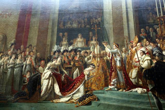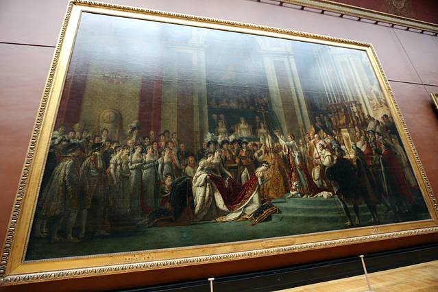 加冕礼之后皇帝拿破仑向大卫预定四幅用于纪念加冕盛况的画,最后完成了两幅,而这个巨幅油画也有两张一模一样的作品,分别保存在卢浮宫和凡尔赛宫。说他们一模一样并不完全准确,因为在凡尔赛的那幅画中,在皇后身后的几位拿破仑的妹妹中,倒数第二位的裙子被画成了粉色,以示区隔于其他人。这是因为在拿破仑第一次被流放的时候,只有他的这位可爱的妹妹去看望过他。