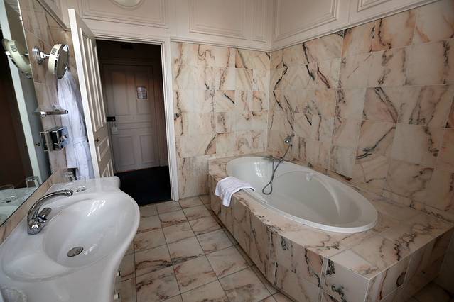 这酒店外观就很不错了,房间里也相当的漂亮,房间很大,差不多30平米左右,浴室就有差不多8-9平米,看着特别的豁亮,和在巴黎的酒店相比,这第一天的城堡酒店简直就是豪宅了!