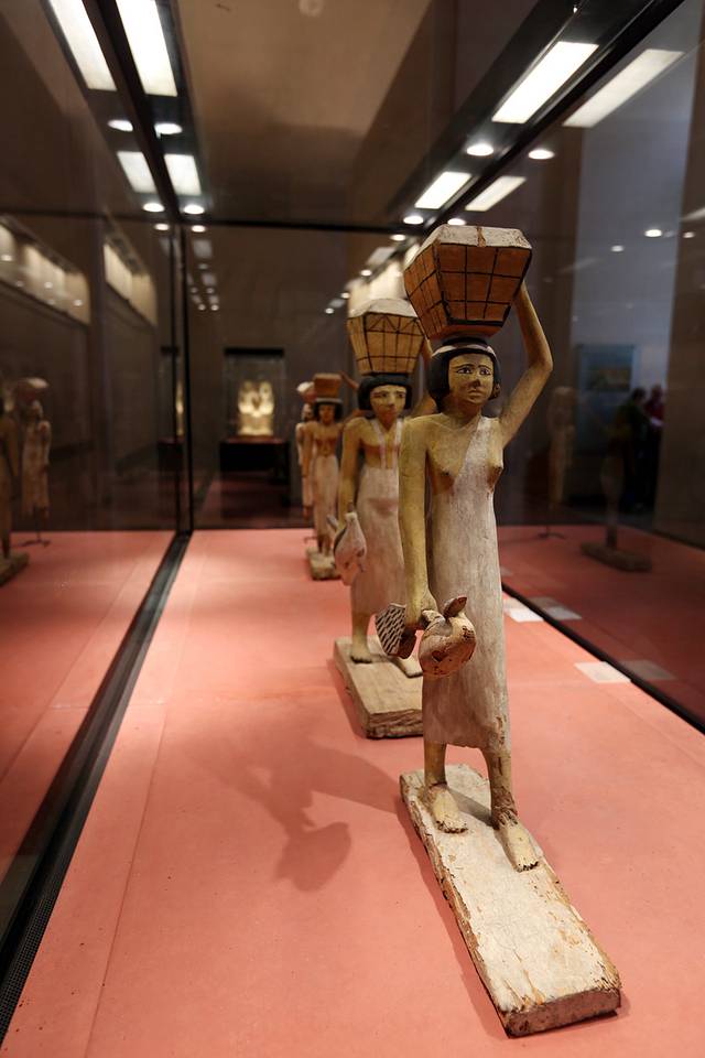 转身到展厅的另外一侧,发现一个有趣的事情,这里展示的大概有10来个人物雕像,站着的坐着的,脸和发型都是一个样,后来才知道,他们都是从一个墓葬中挖掘出来的,而所有的雕像都是同一个人,也就是墓葬的主人阿德古,我想他也应该是个财主,要不怎么这么大排场。