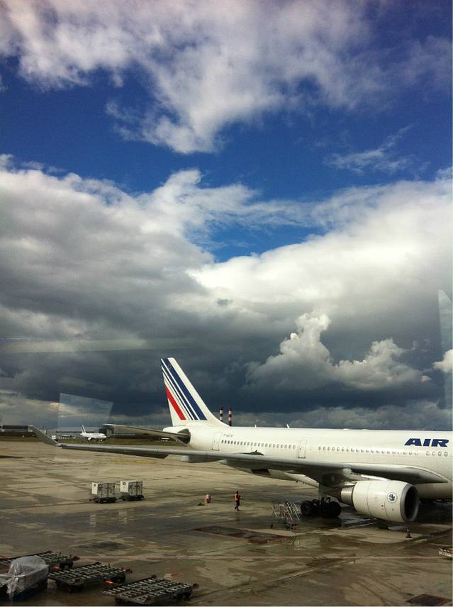 准时登机、起飞晚了一个小时,落地还算准时,充分说明飞机的油门是可以使劲往下踩的!经历了十个小时、8463公里的飞行,我们俩顺利抵达了巴黎戴高乐机场2号航站楼。必须得说说,我们人品真心不错,抵达巴黎的时候还是阴雨,落地之后,居然就这么华丽丽的放晴了~~~~开心呀!