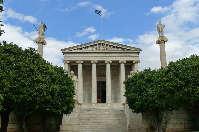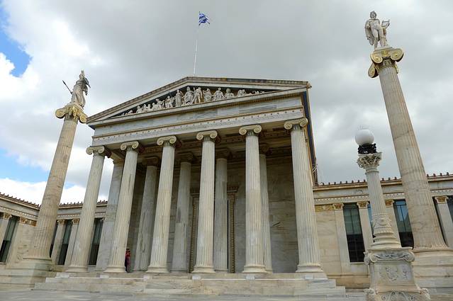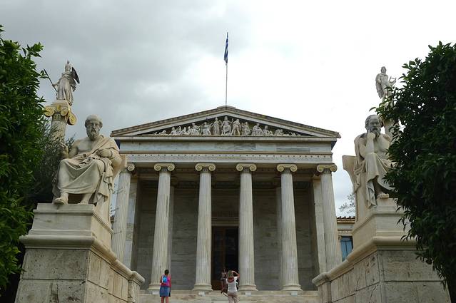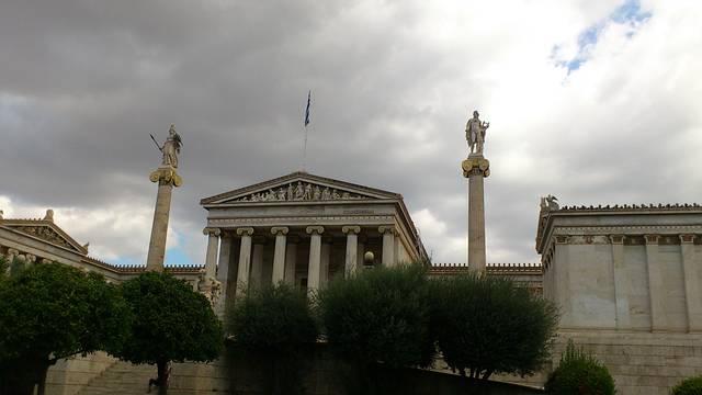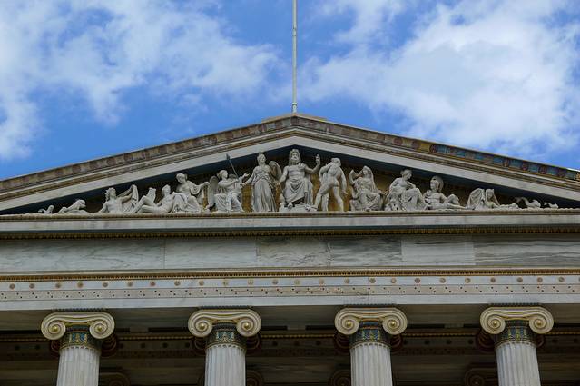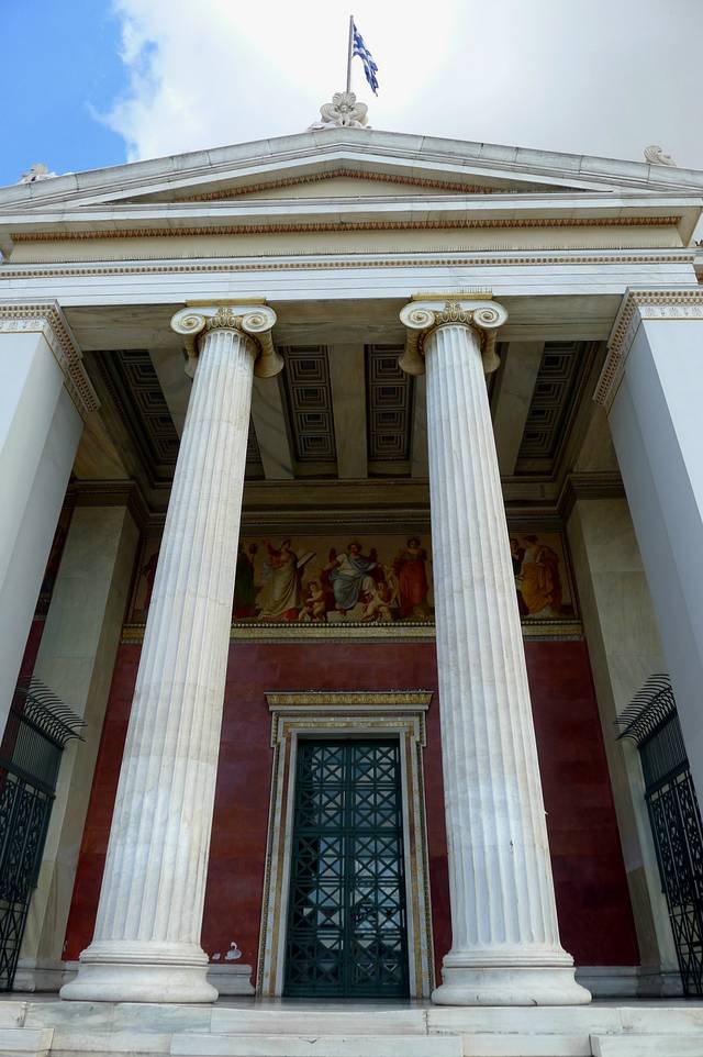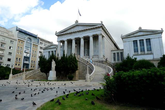 雅典学院(Athens Academy)由伊瑞克提翁神庙获得灵感,伊奥尼亚式廊柱入口由高踞柱顶,代表智慧和光明的雅典娜和阿波罗守护。这个丹麦建筑家Theophile和Christian Hanse兄弟建于1885年的杰作被认为是世界上最美丽的新古典主义建筑。