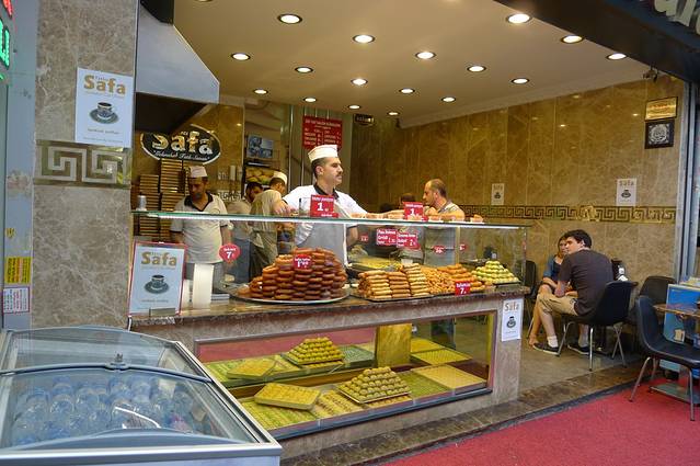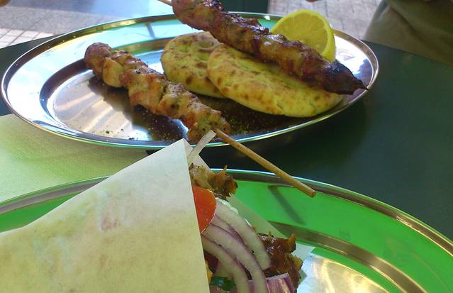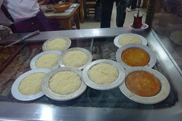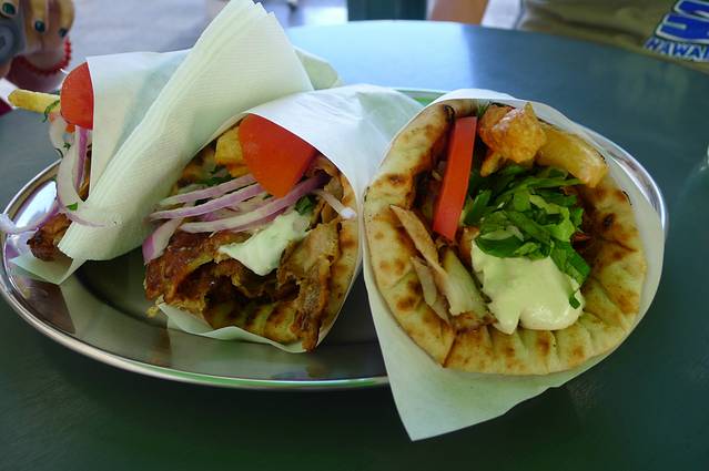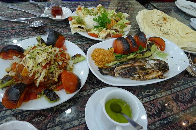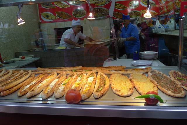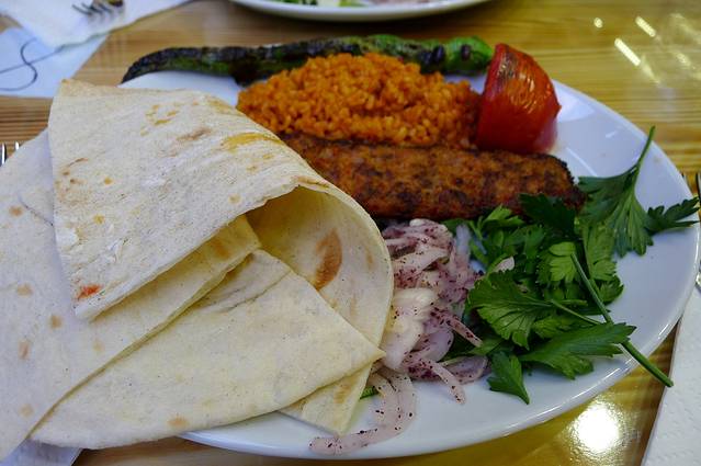 在大铁钳串起来的羊肉或鸡肉中做出选择,然后再选面包或者当地的Pide饼,一般还会加入冷的炸薯条和青椒,橄榄,漆树汁,酸奶,沙拉……价格也很亲民,我印象中好像就5里拉左右吧。