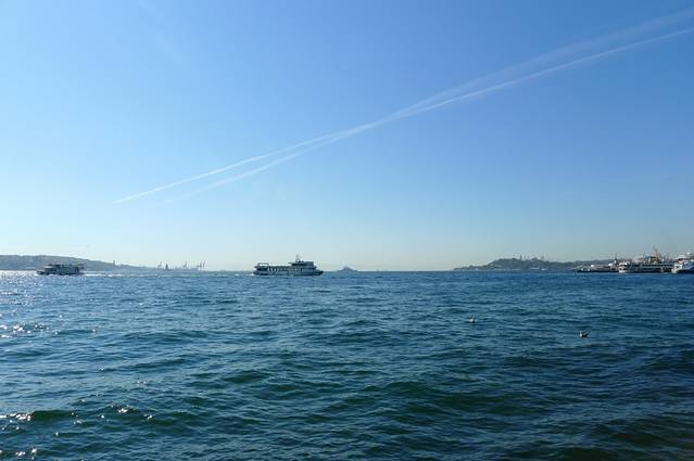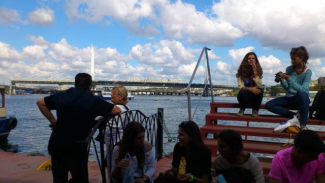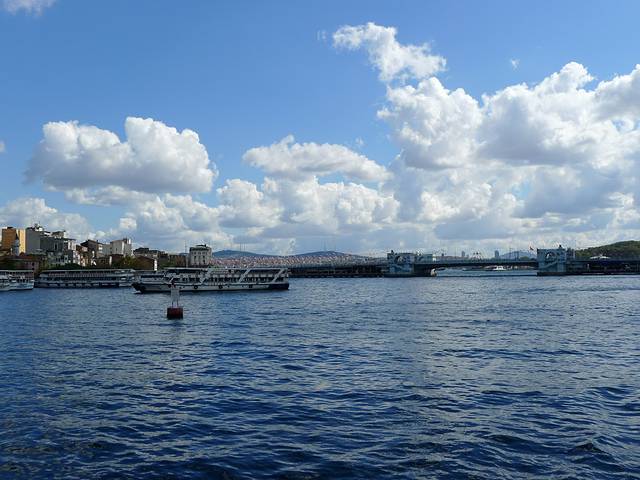打车前往金角湾码头,司机英文太抱歉,走错了N次,把我们带到了大游轮的码头,最后无奈要他在加拉太大桥停下,我们自己去找码头。不过伊斯坦布尔实在是座美丽的城市,加上无敌的好天气,走了冤枉路,却并不生气。