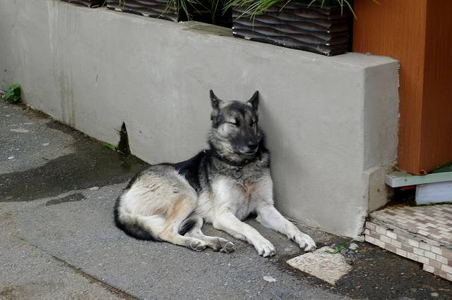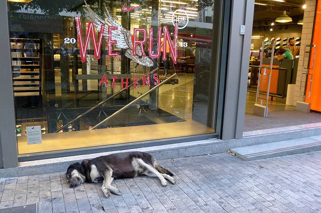 雅典人爱狗,街头到处都是这样的狗狗,毫不设防地倒头大睡。