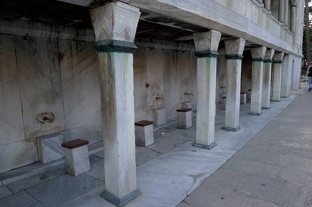 清真寺庭院中央的亭子和四周都有很多凳子和水龙头,可供前往祈祷的信徒在祈祷前清洗。