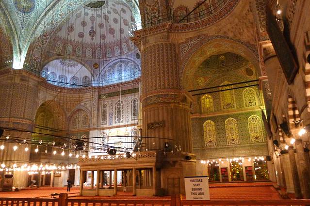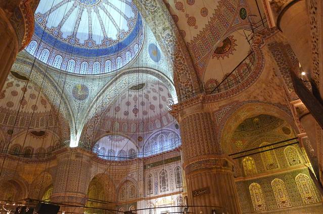 清真寺内部的200多个配有彩绘玻璃的小窗和蓝白两色的彩色瓷砖妆点出如梦似幻的感觉,然而设计师追求安全的四根巨大的圆柱设计使这座16世纪的建筑反而没有1000多年前的圣索菲亚大教堂那样空灵和大胆。