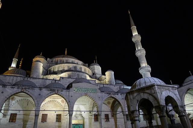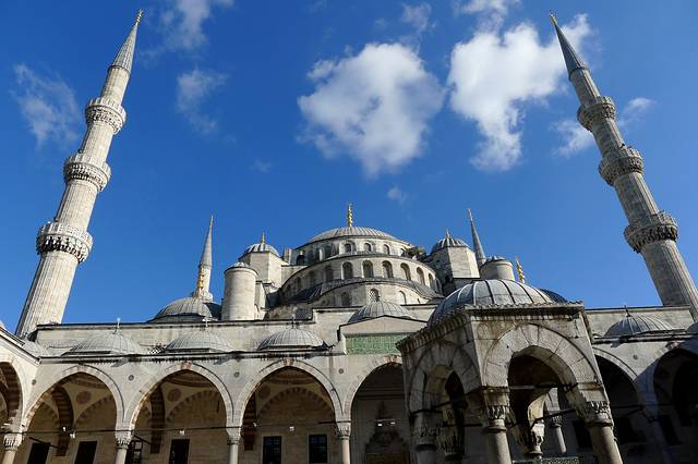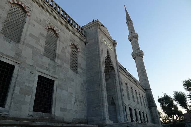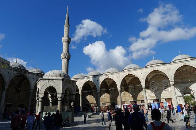 苏丹艾哈迈德清真寺(Sultanahmet Camii),因完全使用蓝白两色的伊兹尼克瓷砖装饰而得名蓝色清真寺(Blue Mosque)。作为伊斯坦布尔的标志性建筑之一,清真寺最出名的有两点,一是六根宣礼塔,二是据说建筑没有使用一根钉子,却历经地震而未倒塌。