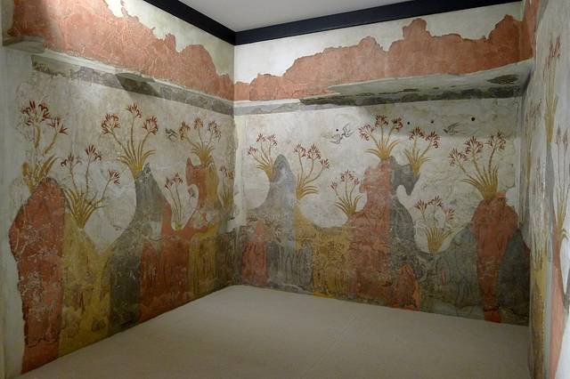 从我着迷的21号雕像展厅上楼,就可以看到来自圣托里尼,也称锡拉岛(Thira)的克里特壁画(Minoan Frescoes)。