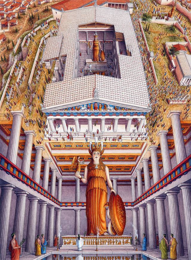 十二主神形象鲜明,姿态各异。高居正中宝座上的主神宙斯和他旁边手持长矛和盾牌的雅典娜尤其引人注目。