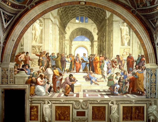 《雅典学院》是以古希腊哲学家柏拉图所建的雅典学院为题,以古代七种自由艺术——即语法、修辞、逻辑 、数学、几何、音乐、天文为 基础,以表彰人类对智慧和真理的追求。拉斐尔以回忆历史上“黄金时代”的形式, 寄托他对美好未来的向往。