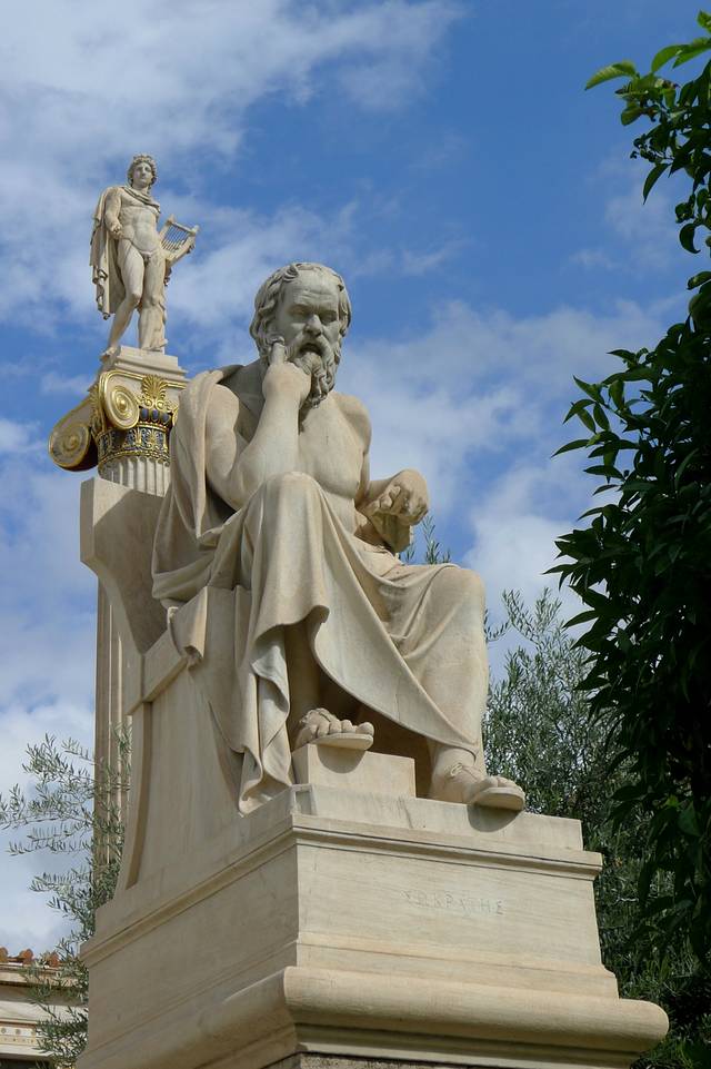 雅典学院前四尊主要雕塑也来自拉斐尔的名画。高高矗立在艾奥尼亚柱顶端的雅典娜和阿波罗分别象征智慧和真理,而台阶前的古希腊哲学家苏格拉底和他的学生柏拉图则象征着古希腊的黄金时代。