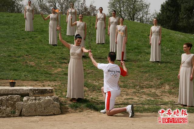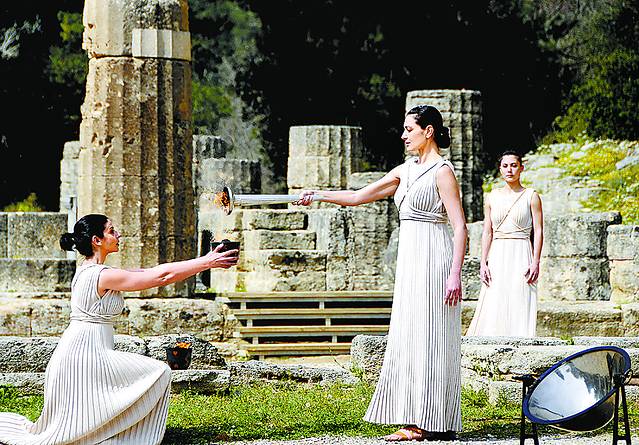 奥运会的圣火由最高女祭司在奥林匹亚赫拉神庙用凹透镜利用阳光引燃火种,圣火点燃后,火种置于一个古老的火盆中由首席女祭司带到古代奥运会场内的祭坛,点燃第一名火炬手手中的火炬,随后开始它前往奥运会主办城市的行程。