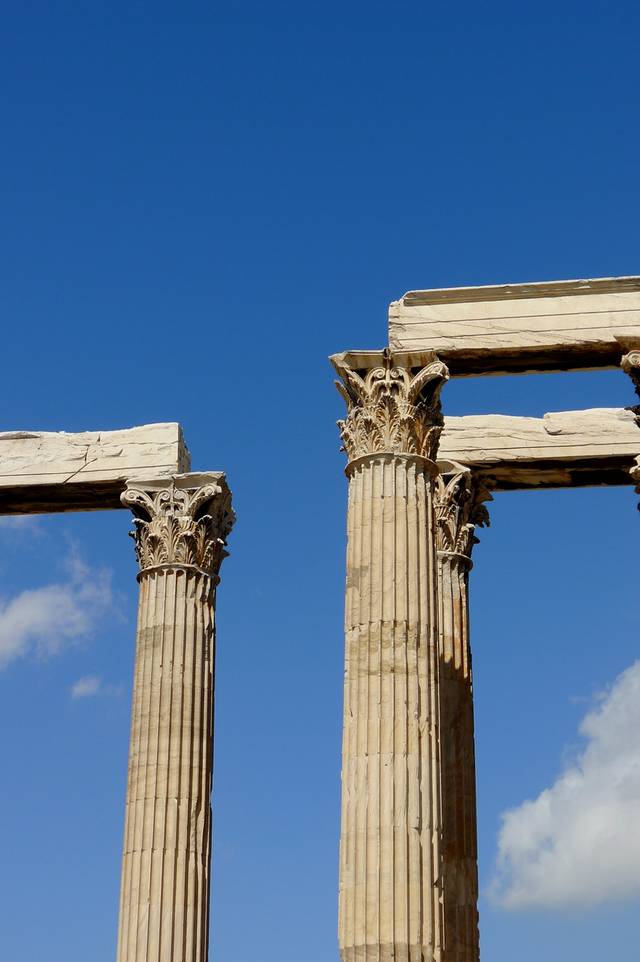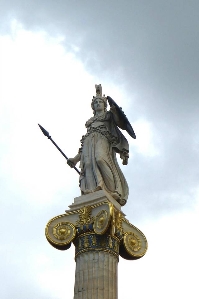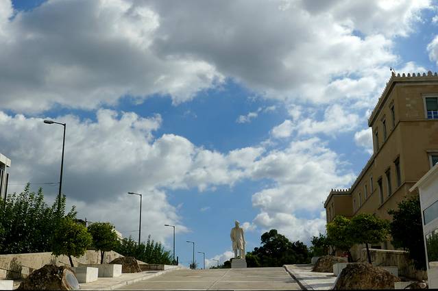 首先到达雅典学院。这个早晨意外地阴云密布,却向我展示了雅典另一方面的美。雅典娜手持长矛,彷佛在与快速流动的乌云搏斗,阿波罗弹奏着他的七弦琴,太阳已经开始对光明之神展露笑容。
