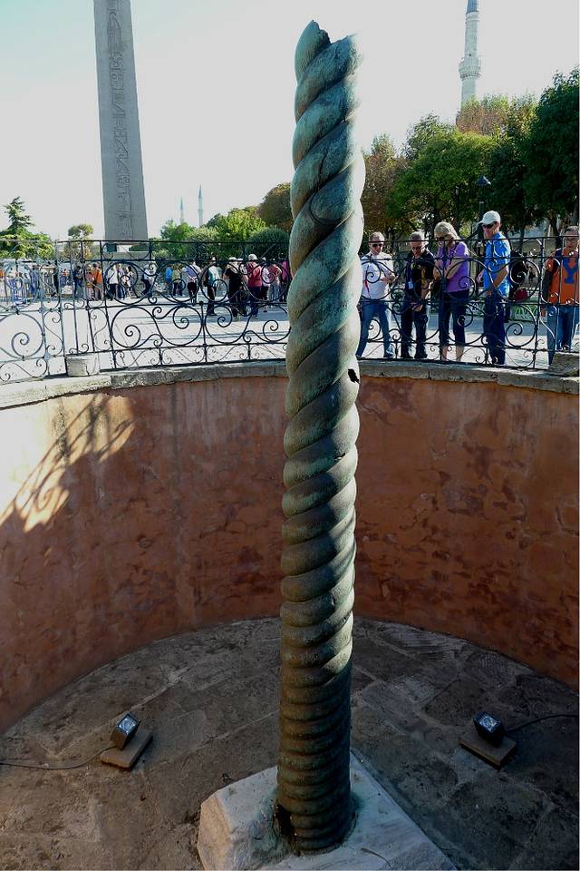 蛇柱也是跑马场上古老的景观。这根柱子不大,从地下洞穴中伸出,据说它本来是一个由三条缠绕的毒蛇支撑的金水盆,为了纪念希腊联军打败波斯军队而在公元前400多年立在德尔斐的阿波罗神庙,后来被君士坦丁大帝带回了自己的新首都。