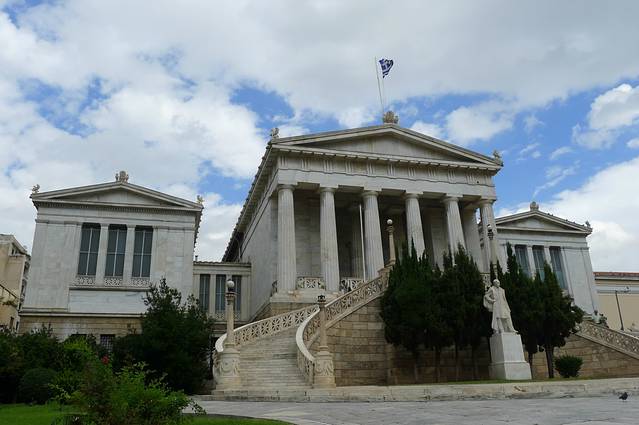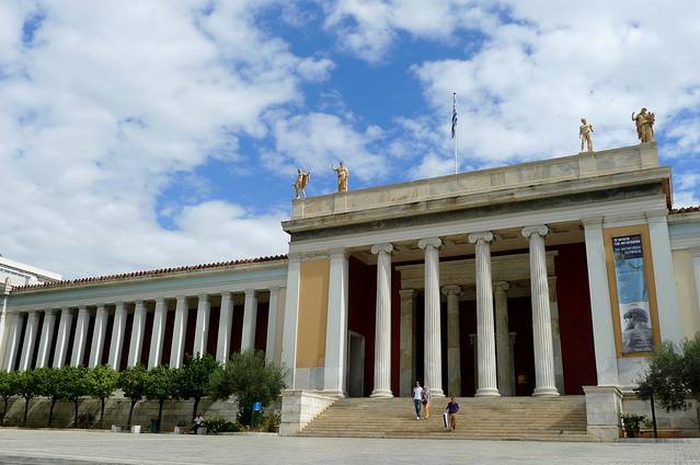 大学另一边的希腊国家图书馆(National Library)由Hanse兄弟中的哥哥Theophile设计,是一幢纯粹的大理石建筑。来自童话王国的这对兄弟童话般地向雅典献上了不朽的新古典主义三部曲。