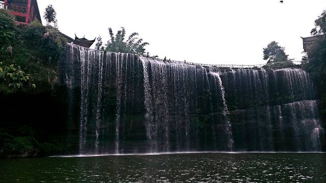 从鸡冠岭出来,途径照影谭、迎风湾、七彩湖,由于时间紧(赶缆车下午5点30下班,不过人多会延时),我们也没有划竹筏的打算,就没有停留,直接到达七彩飞瀑。所有景点汪师傅都是亲自带路兼导游,还帮我们拍照,真是多少感谢都不足。晴天可以看到彩虹,所以称之“七彩飞瀑”,不过阴天也看到了它的壮观。