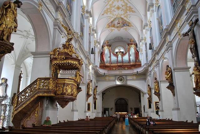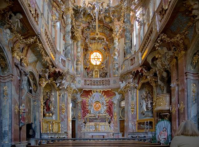 阿桑教堂隐没于闹市的建筑之中,曾是私人教堂,后被迫对公众开放。从外表看其貌不扬,但内部华丽无比,是富丽堂皇的巴洛克和精雕细琢的洛可可风格的杰作。在紧凑的空间内,将如此繁复的装饰完美得融于一体,令人眼花缭乱。