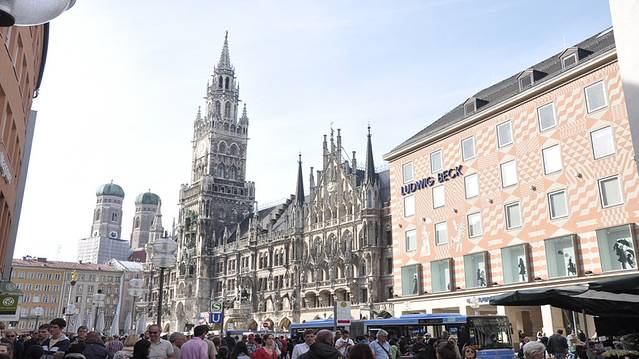 圣母教堂(Frauenkirche)这座后期哥特式的庞大建筑物将近百米高,以红砖砌成,高高耸立,壮硕的外型、鲜明的色泽。当你找不到方向的时候,看到她,就如同找到了坐标和指引。在慕尼黑很多地方都可以看到那高耸的圆顶钟楼。