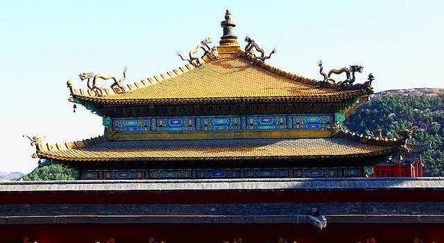 前半部为汉式庙宇风格,后半部融进藏式风格