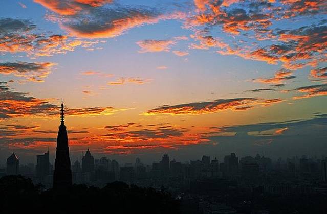 介于西湖与钱塘江之间,凌空突兀,衬以蓝天白云,更显得山姿雄峻巍峨