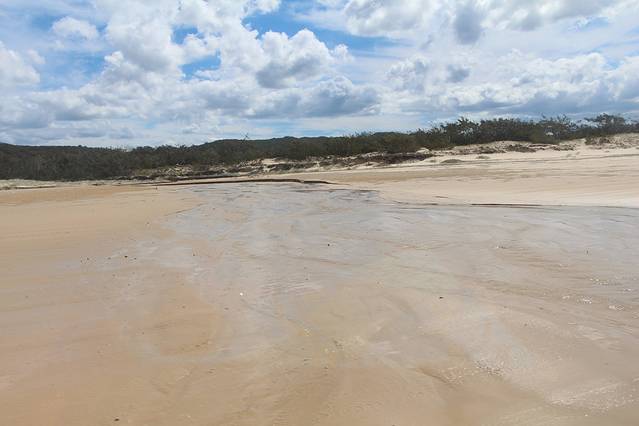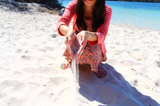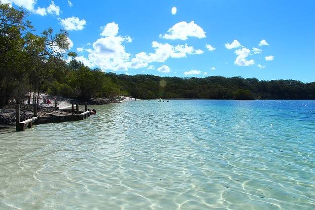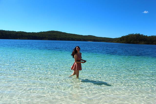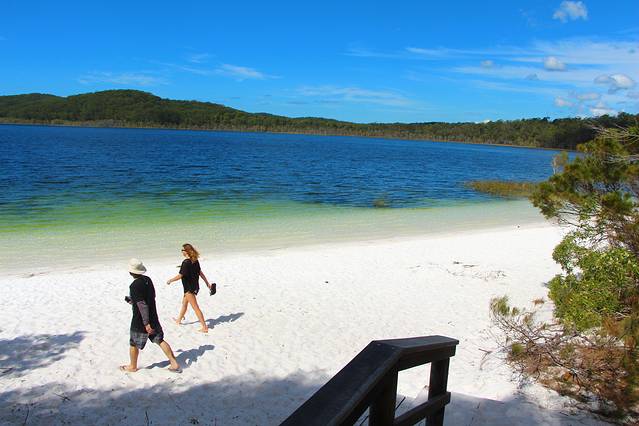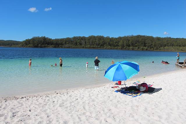 开车来到行程中的第二个湖——Lake Birrabeen。水是墨绿色的,不是那么清澈不过除此之外和Lake McKenzie没有太大的区别,蓝天,绿水,白沙。只可惜水有点冷,我们没有做过多的停留,而且小吃货对于墨绿色的水没有什么好感,我们就直接前往下一个景点了。